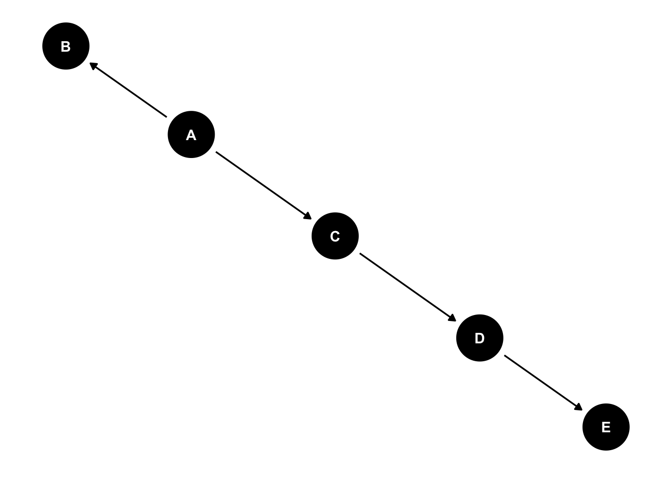 First, consider a simple problem. Let’s assume we have a dataset with five variables. Each variable has two categories. Suppose we wanted to find the joint probability of these five variables; for convenience, let’s label them A, B, C, D, E. To find the joint probability of these five two category variables, this would involve a table with \(2^5=32\) entries. Say we switch things to five five category variables. Now there are \(5^5=3125\) possible combinations. This is really cumbersome, and can be simplified using a graph structure.