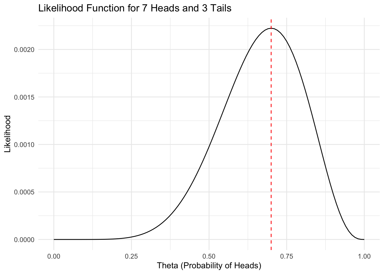 We’ve now observed the data, and instead of knowing \(\theta\), we can estimate the most plausible value of \(\theta\), considering our data. If we flip a coin ten times and observe seven heads, what is a value of \(\theta\) that is most likely to produce this sequence of results? It’s 0.7; the maximum likelihood estimate of \(\theta\) is 0.7.
