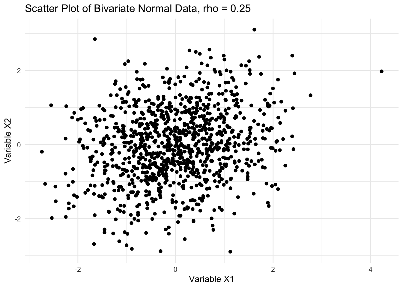 labs(title = "Scatter Plot of Bivariate Normal Data, rho = 0.25",